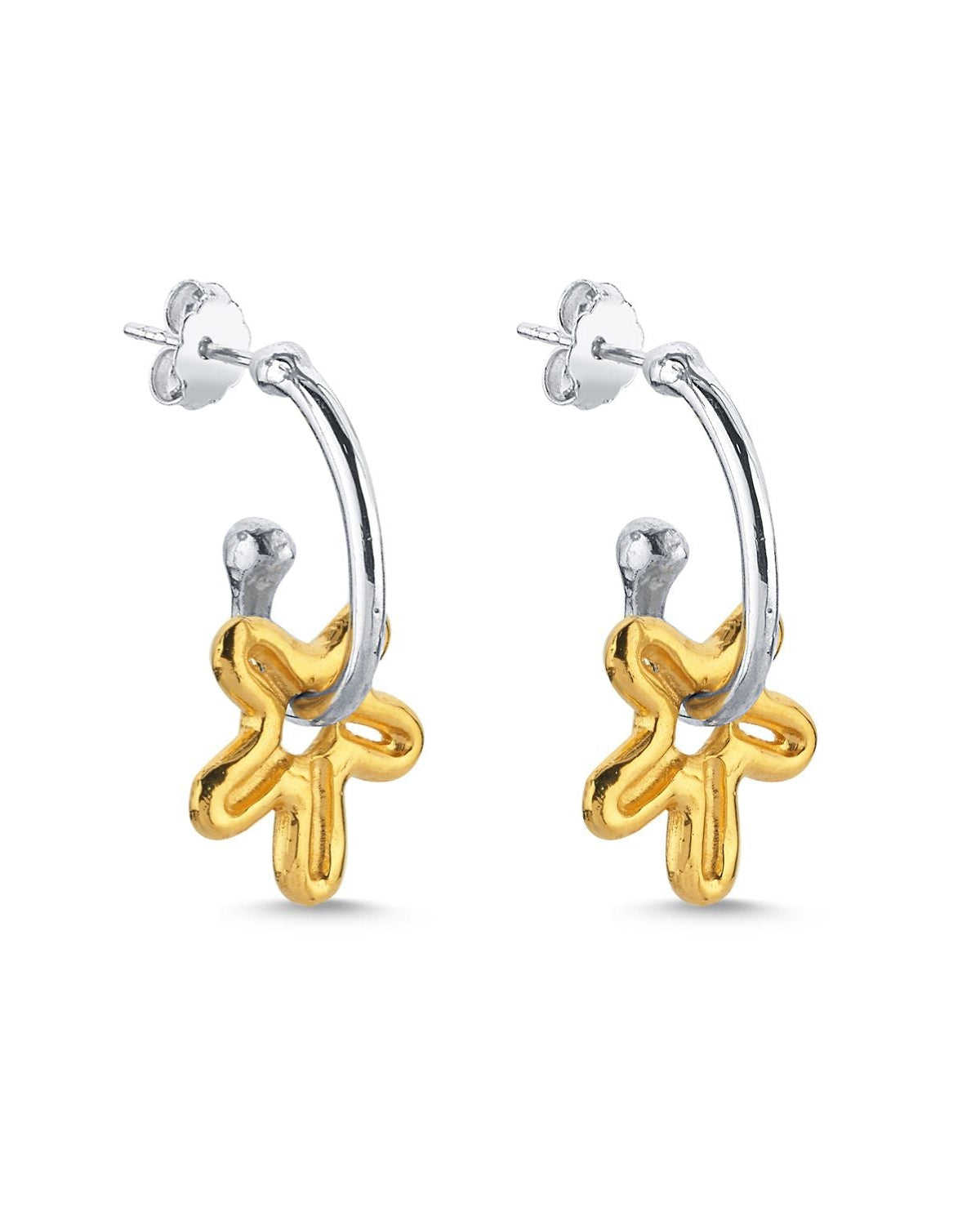 Gümüş ve gümüş üzerine altın kaplama detayların bir araya geldiği bu küpe setinde, bir çift gümüş halka ve iki adet çiçek charm bulunuyor. Dinamik stiline neşe katmak için bu seti tercih et.