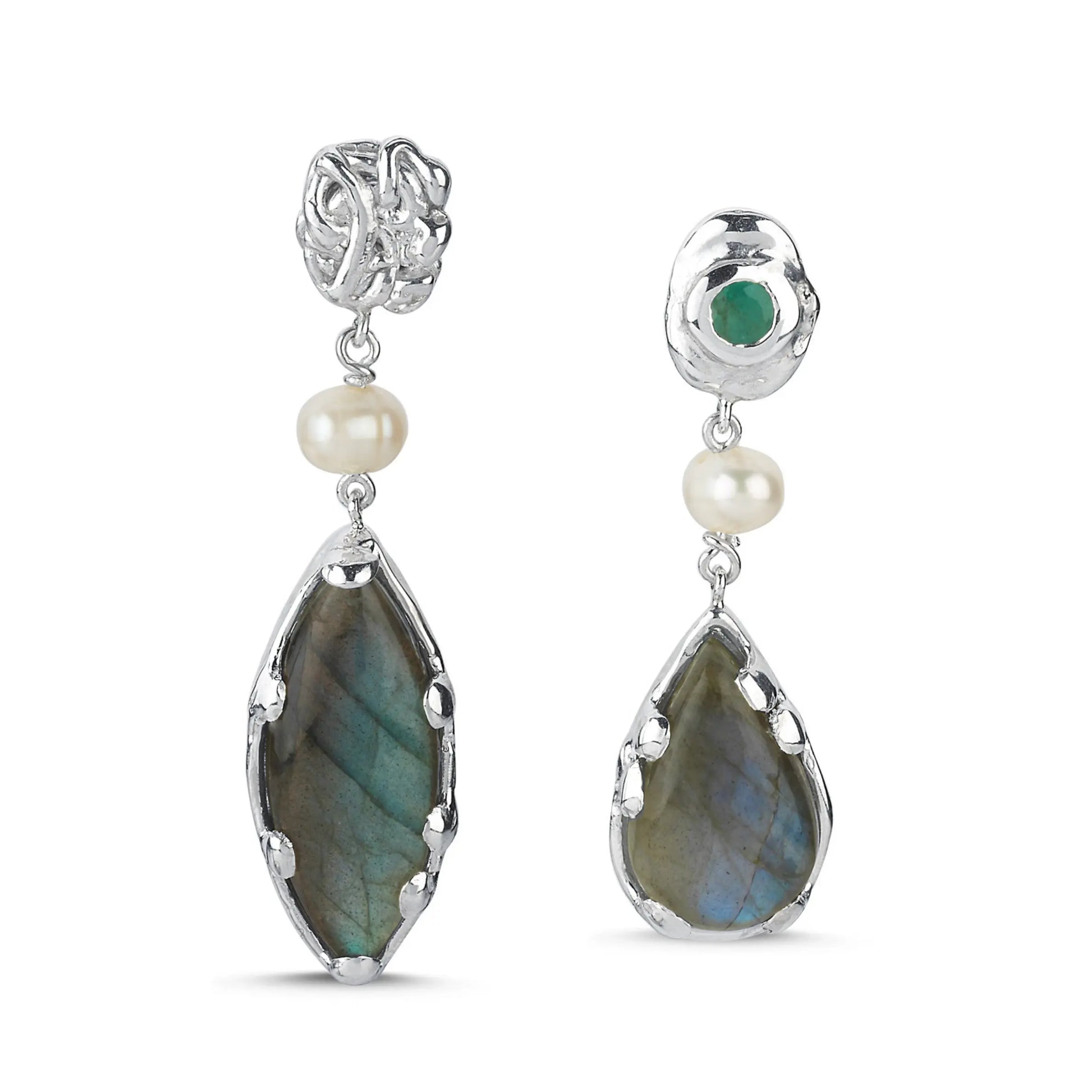 Asimetrik tasarımlı 'Anima Maris' küpeleri, labradorit yansımaları ve inci detaylarıyla deniz ışıklarının büyüsünü kulaklarına taşıyor.
