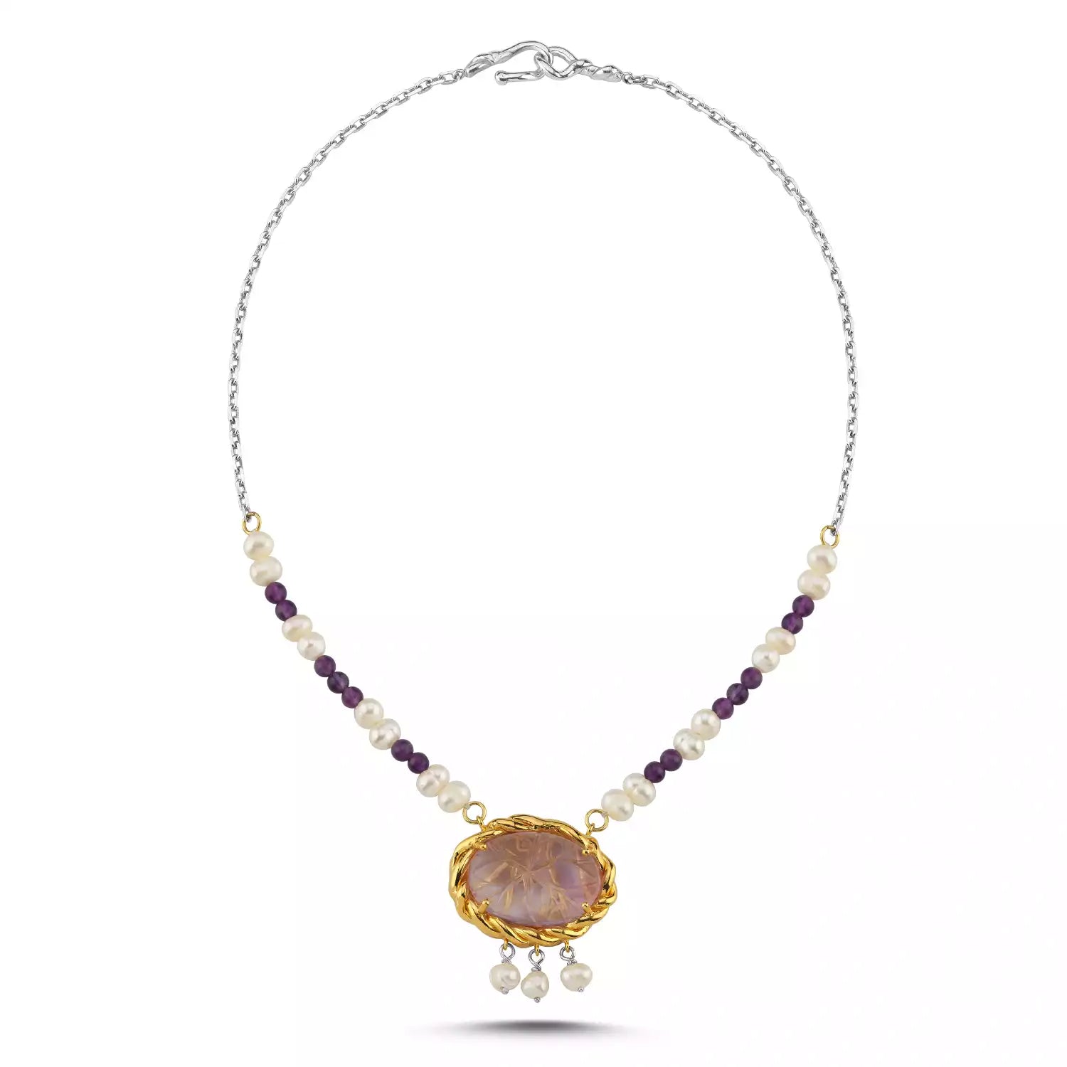 El oyması çiçek motifli ametist ve düzensiz incilerle tasarlanan 'Arcana Maris' kolyesi, denizin saklı güzelliklerini boynunda taşıyor.