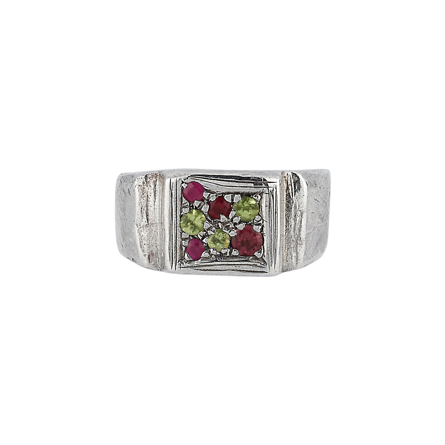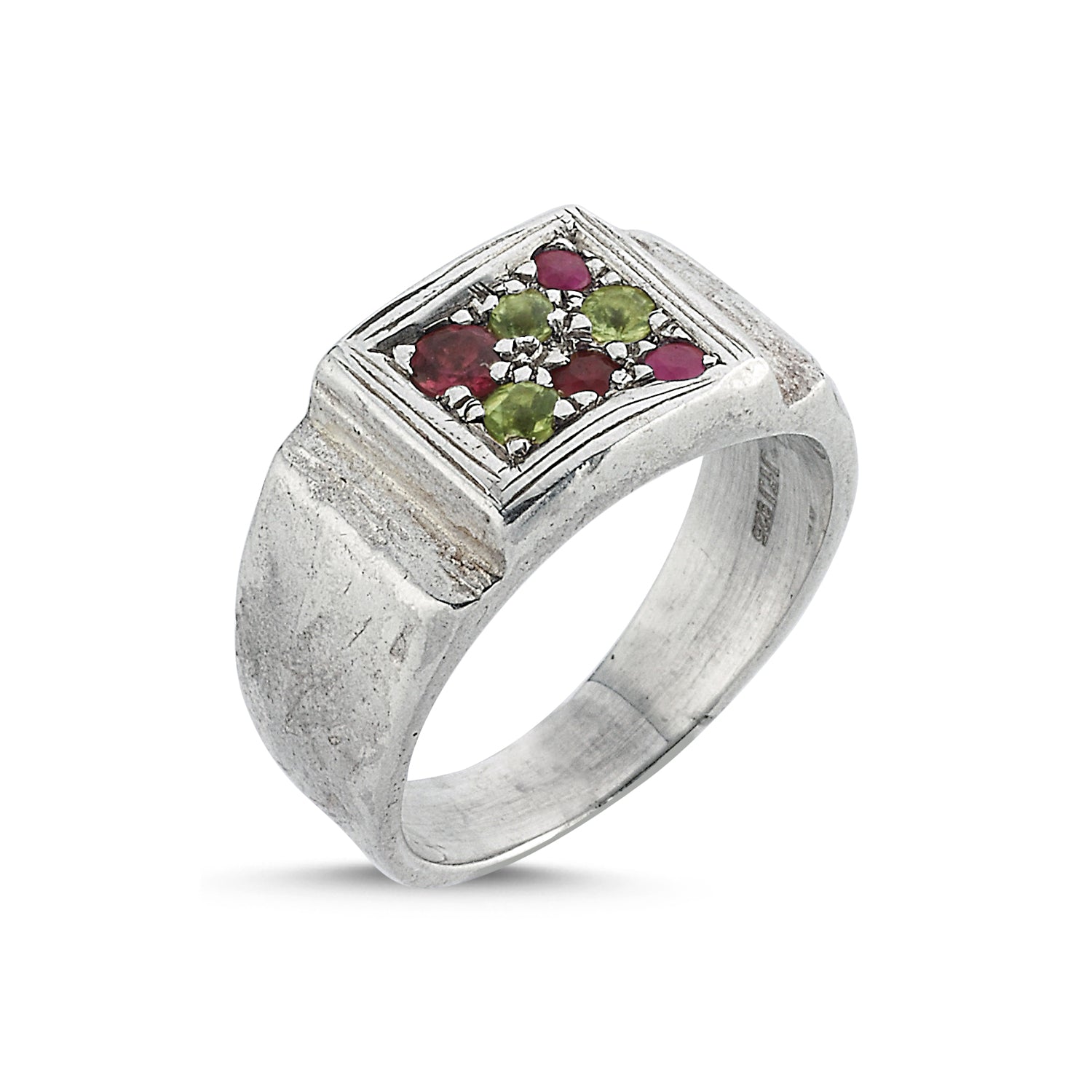 Pave mıhlama ile doğal taşların bezendiği gümüş yüzük, Betina'nın babaannesinin eski bir yüzüğünden ilham alır. Peridot, yakut ve rodalit taşlarla süslü bu yüzük serçe parmak yüzüğü olarak tasarlandı.