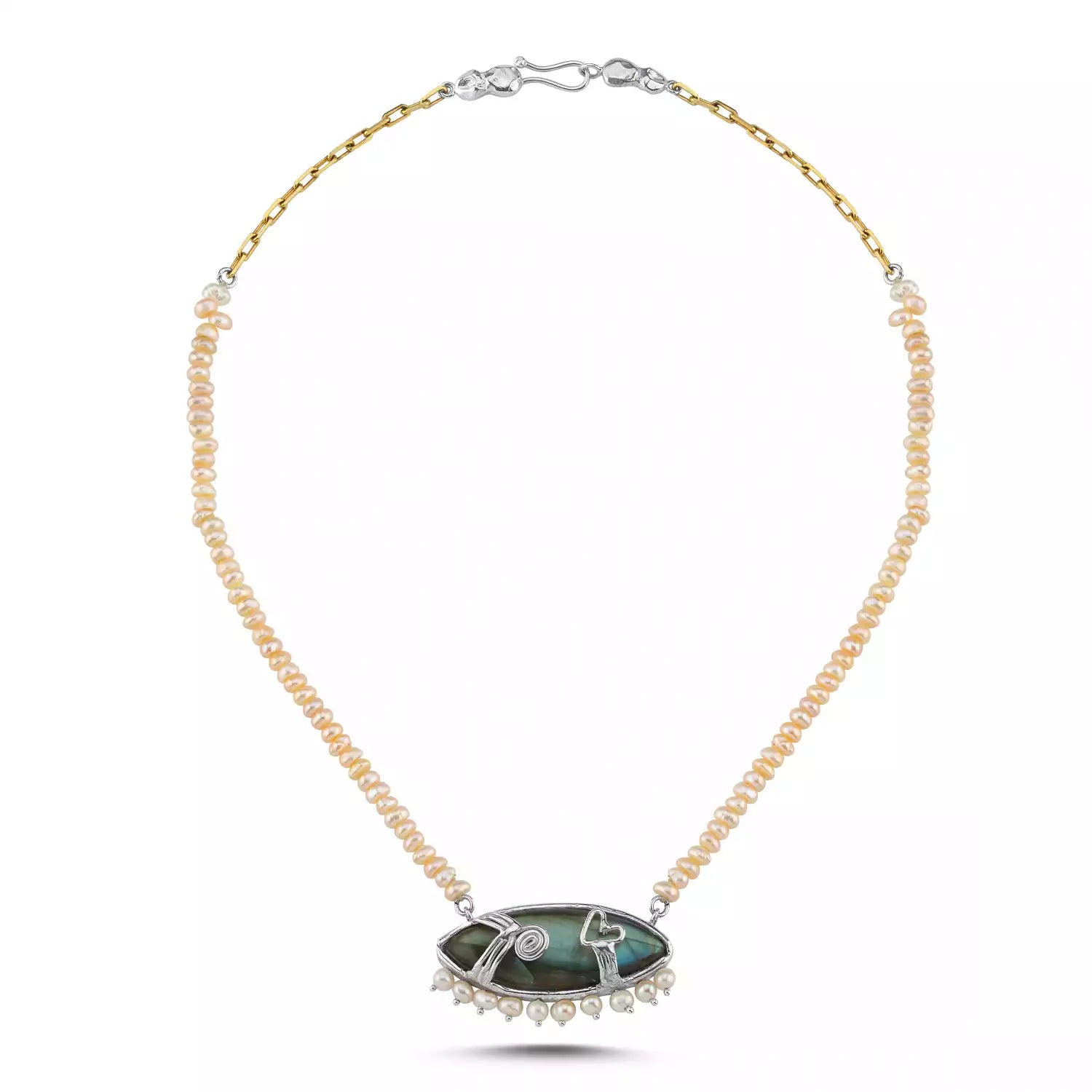 Reflexio kolyesi, labradorit ve incinin uyumuyla deniz yüzeyindeki ışık oyunlarını boynunda parlatıyor.