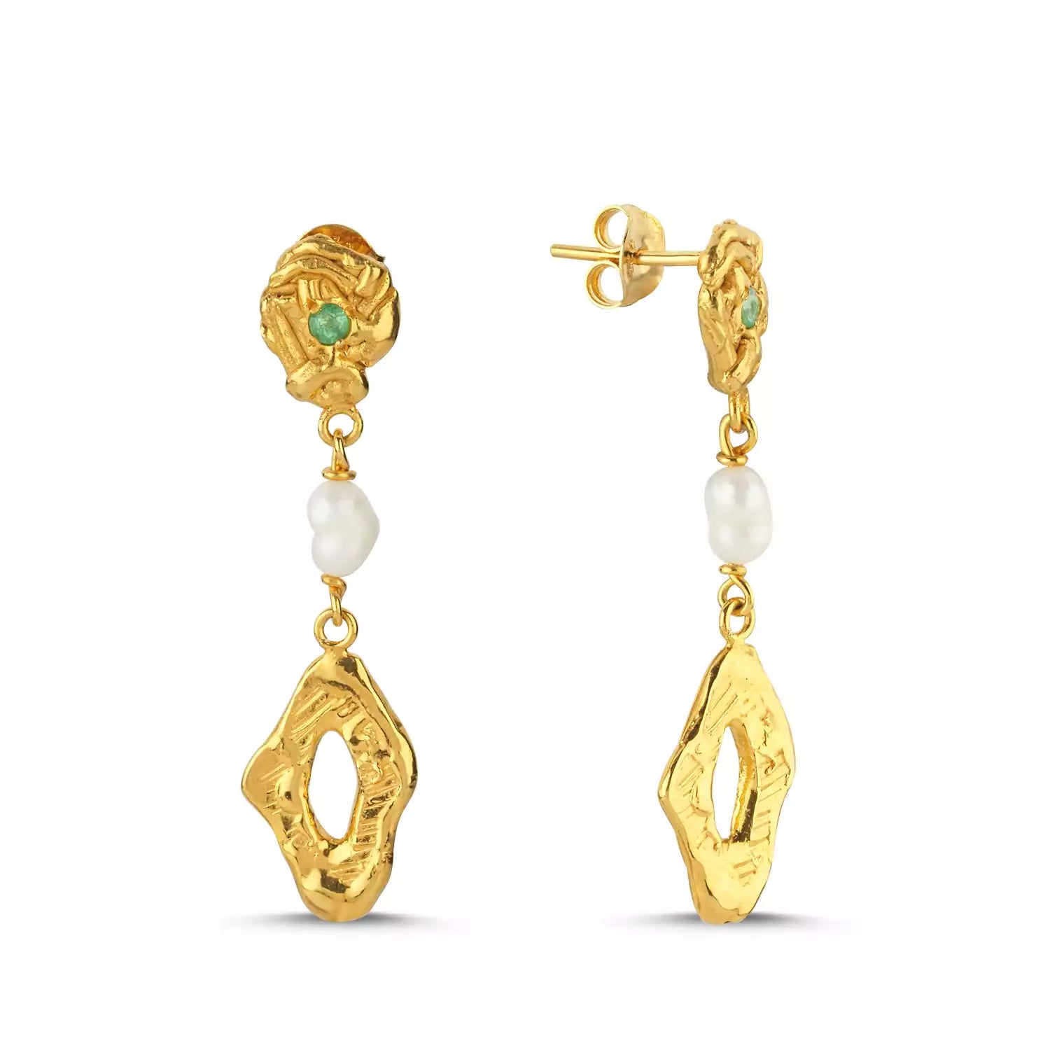 Deniz kıyısındaki kayaların izlerinden ilham alan Trace küpeleri, tsavorit garnet ve incilerle kulaklarında dalgaların dokusunu dans ettiriyor.